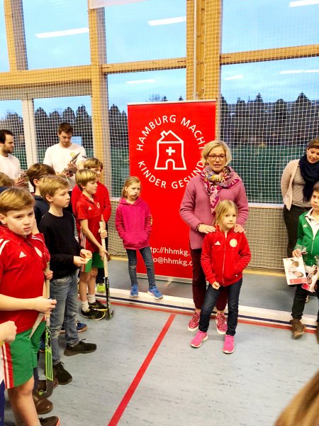 Nach einem Siebenmeterschiessen gegen einen Herrentorwart gab es zum Schluss dann eine Siegerehrung für alle Mitwirkenden - und die Kinder hörten aufmerksam zu, als die Initiatoren dieses Events berichteten, wie und mit welchen Projekten HHmKg die Kindermedizin in ganz Hamburg unterstützt.